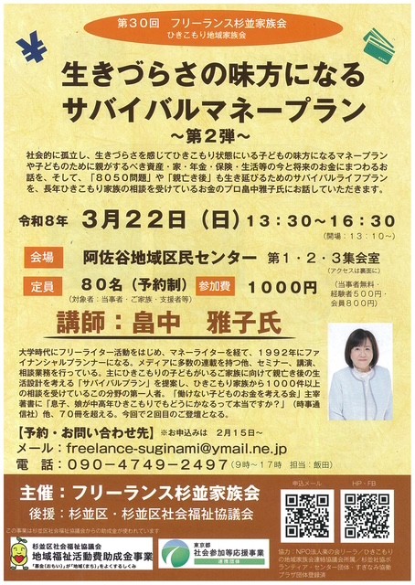 社会的に孤立し、生きづらさを感じてひきこもり状態にいる子どもの味方になるマネープランや子どものために親がするべき資産、家、年金、保険等の今と将来のお金にまつわるお話を、そして、「8050問題」や「親亡き後」も生き延びるためのサバイバルライフプランを、長年ひきこもり家族の相談を受けているお金のプロ畠中雅子氏にお話していただきます。